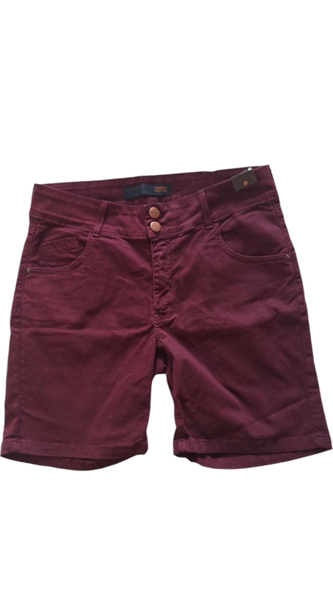 SOBRE: BERMUDA PEDAL FEMININA COLOR PLUS SIZE COR BORDÔ VINHO ESCURO COM BOLSOS GRANDES E LARGOS PASSANTE PARA CINTO CÓS ALTO BOTÃO PERSONALIZADO ZIPER EMBUTIDO.
