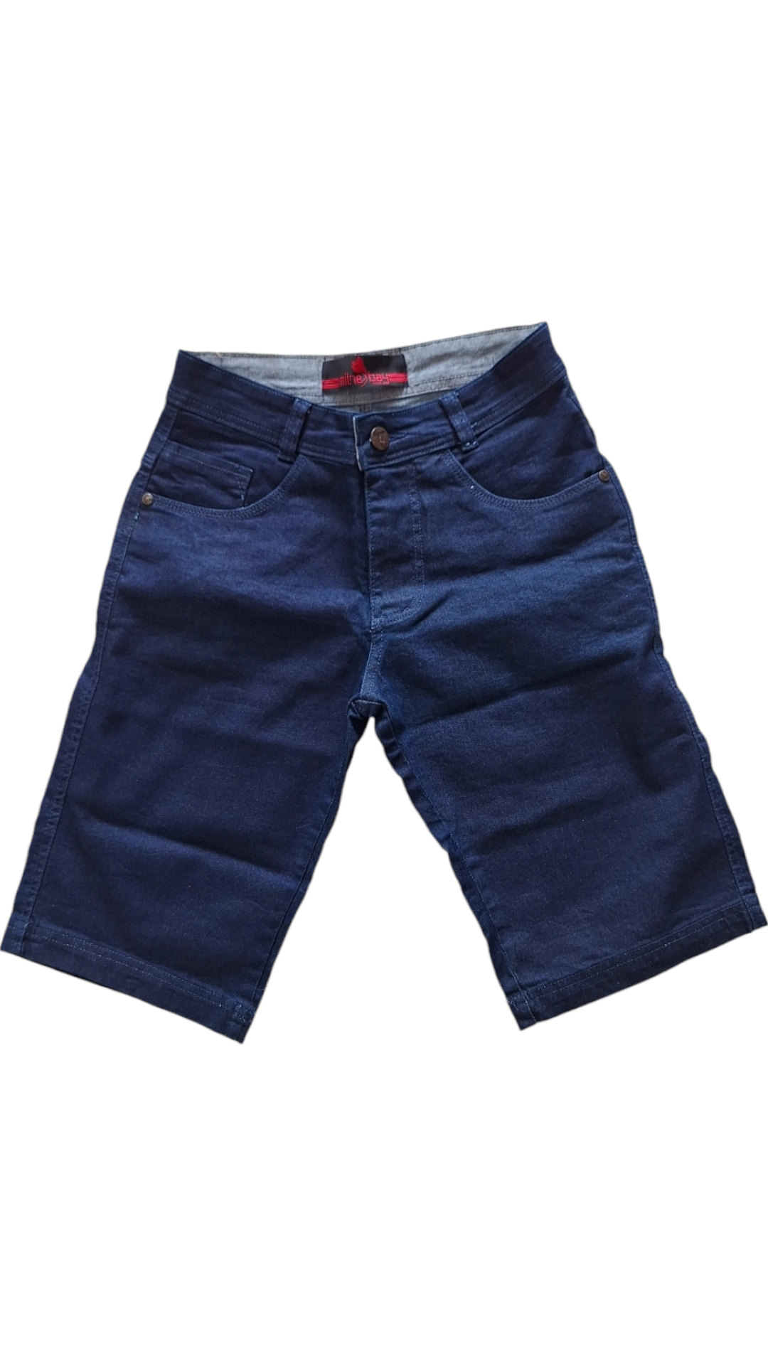 SOBRE: BERMUDA LISA JEANS MASCULINA AZUL ESCURO COM BOLSOS LARGOS EFUNDOS COM CÓS ALTO PASSANTE PARA CINTO.
