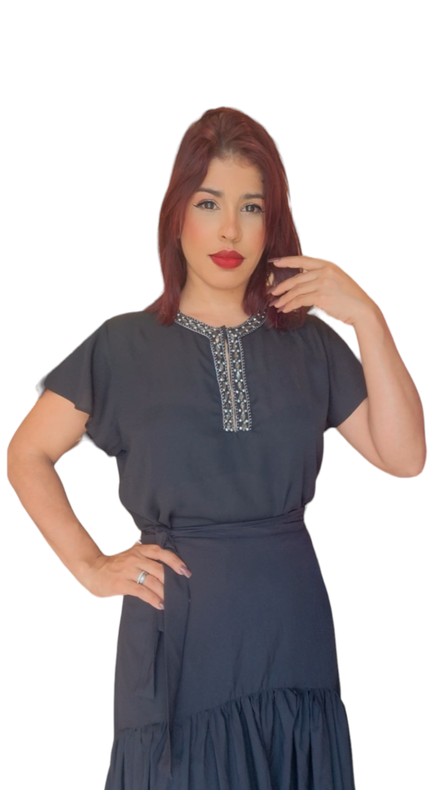 BLUSA FEMININA CHARME COM DETALHES EM PEDRAS NA GOLA COM FECHO