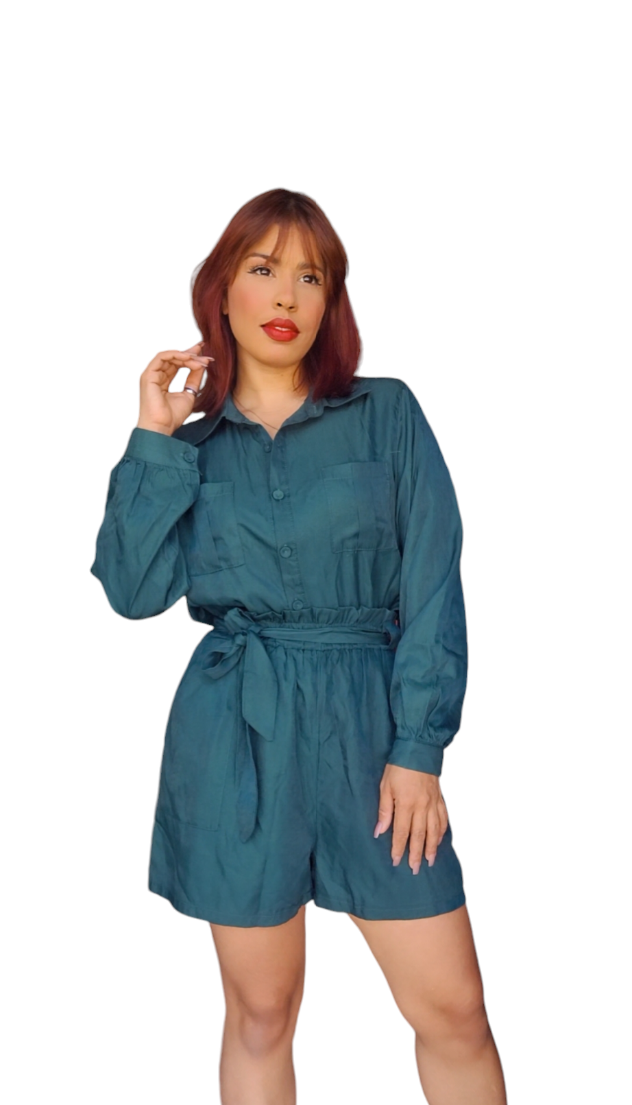 CONJUNTO MEL CETIM VERDE MILITAR FEMININO SHORT COM CINTO BLUSA GOLA POLO MANGA LONGA COM BOLSO GRANDE E BOTÕES TECIDO LEVE E DESPOJADO