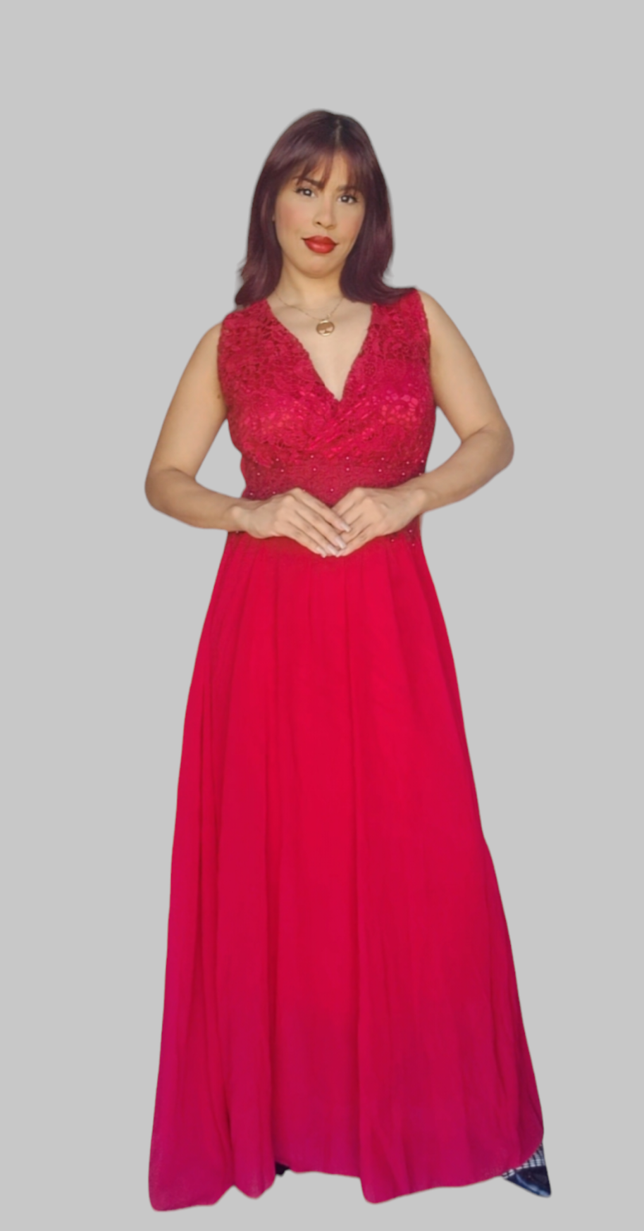VESTIDO LONGO FEST FORRADO COM BOJO ALÇAS GROSSAS RENDA COM PEROLA ELASTANO NA CINTURA DECOTE EM V