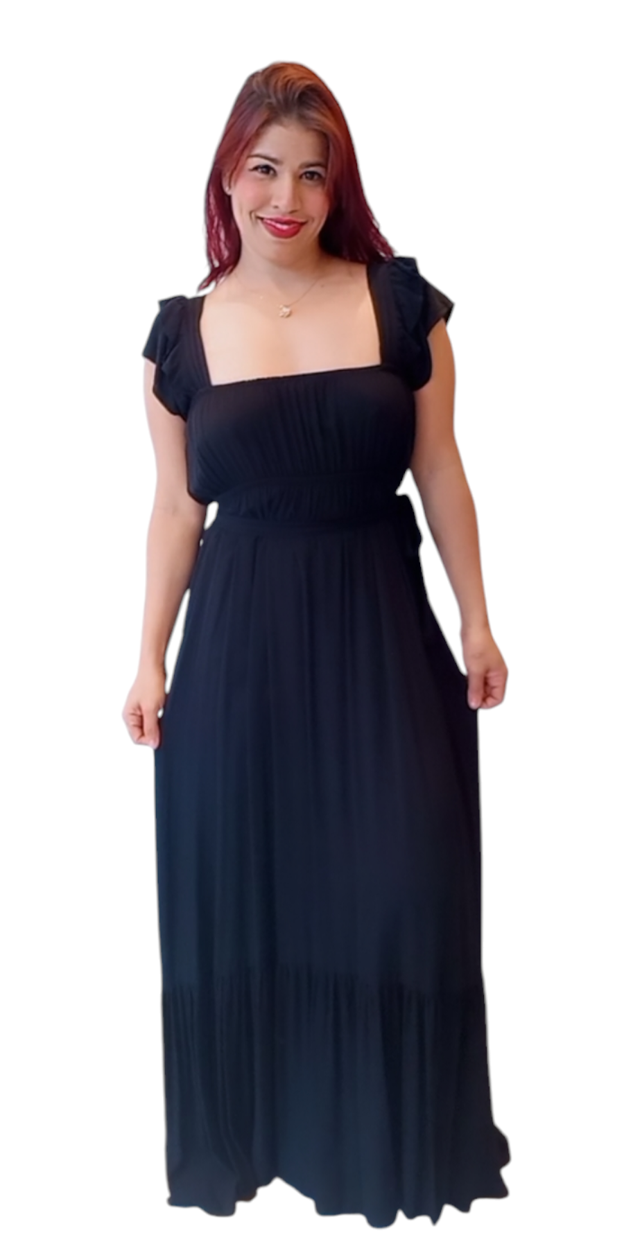 VESTIDO LONGO VISCOSE LISO BLACK EM ALÇAS EM BABADO